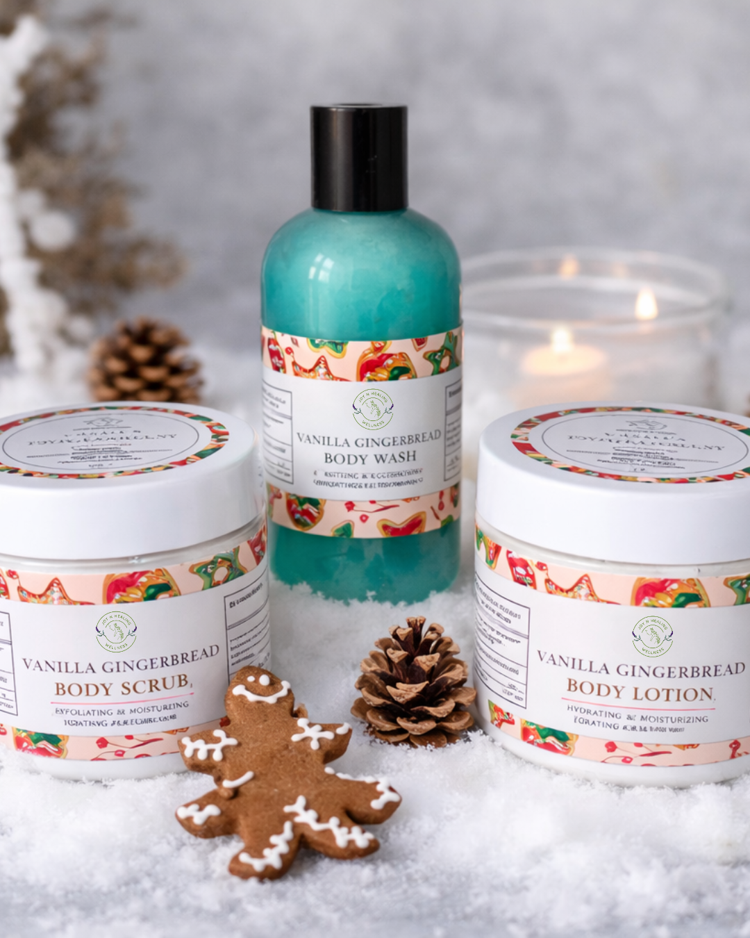 Bring the magic of the holidays to your skincare routine with our Vanilla Gingerbread Set! This luxurious trio includes a nourishing Body Lotion, an exfoliating Body Scrub, and a gentle Body Wash, all infused with the warm, festive scents of vanilla, ginger, and cinnamon essential oils. Enriched with Vitamin E, this set is designed to moisturize, protect, and rejuvenate your skin, leaving it soft, glowing, and holiday-ready.